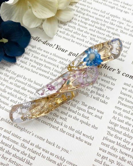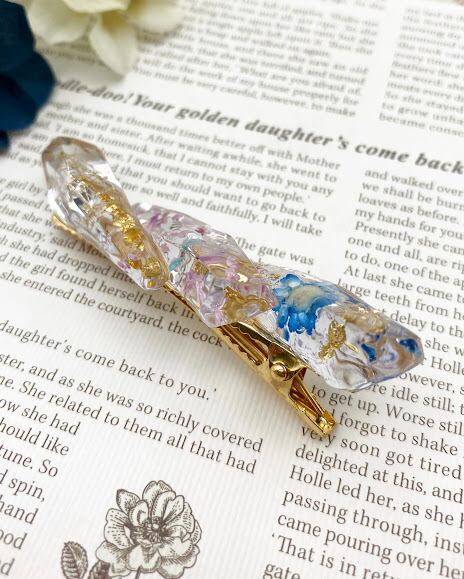 【送迎・公園遊びに】サッと留めて、後ろ髪に宝石の輝き。青とピンクの花々が舞う「鉱石レジン」のヘアクリップ。