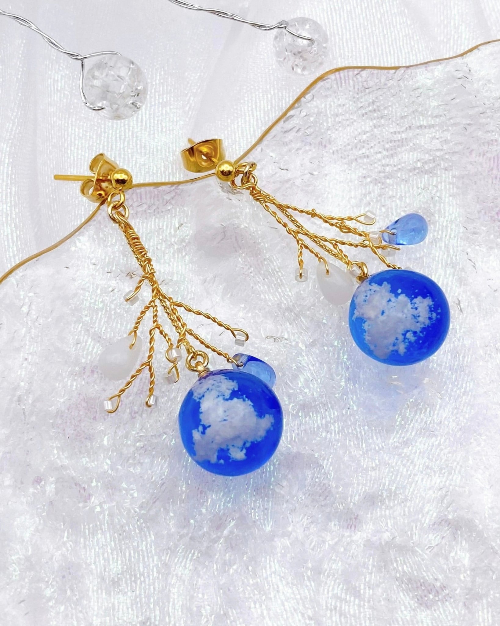 【自分を甘やかす時間に】アレルギー対応|耳元に飾る小さなアート。澄み切った空ともくもく雲の球体レジンピアス。ゴールドワイヤーの煌めき。