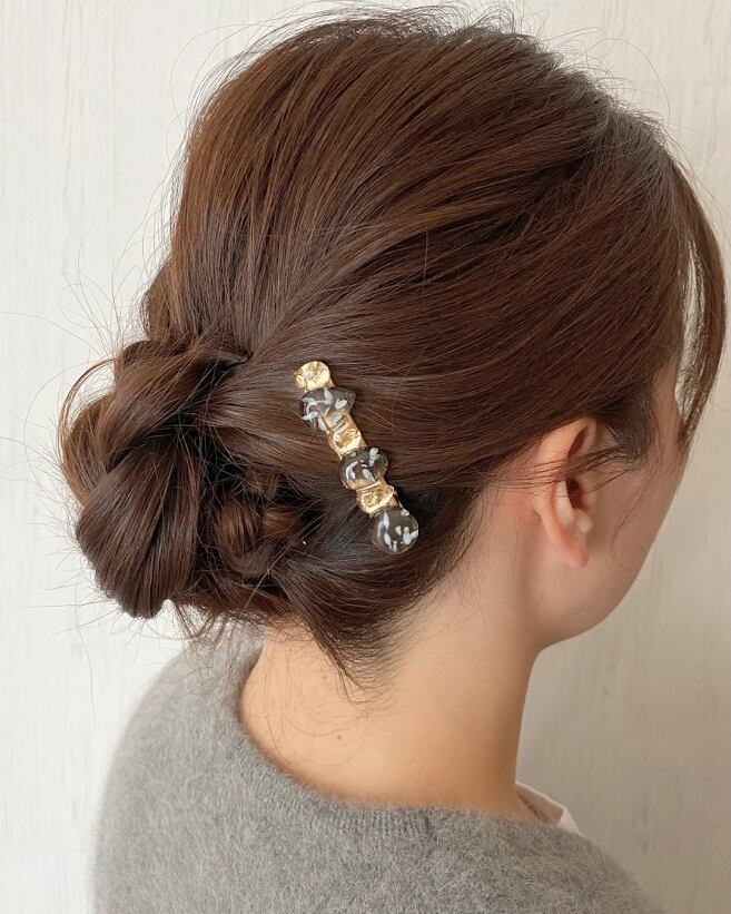 【行事・セレモニーに】知的な品格を添える。スモーキーブラウンと金箔のヘアクリップ。結んだ髪に留めるだけで、横顔まで洗練された印象に。
