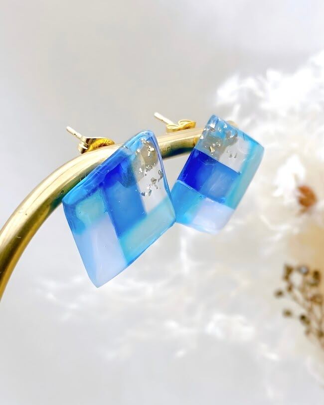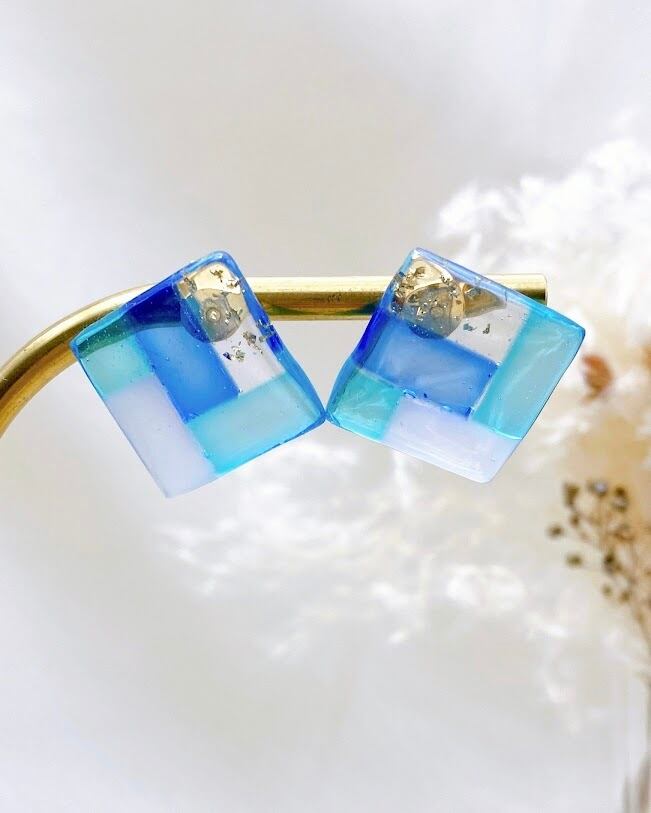 まるで澄み切った空気をそのまま切り取ったような、透明感が美しいタイルを組み合わせたピアス/イヤリングです。