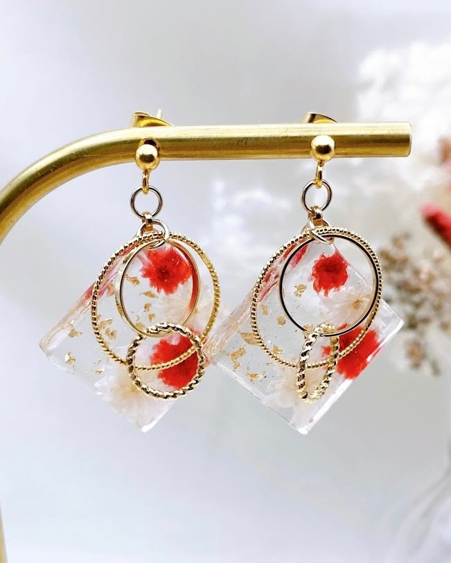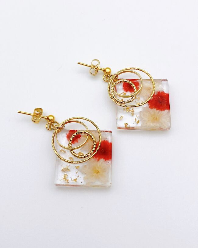 【入園式・七五三に】アレルギー対応|ハレの日を彩る紅白。ドライフラワーと金箔のスクアレジンピアス。ゴールドフープが揺れる、華やぎの耳元。