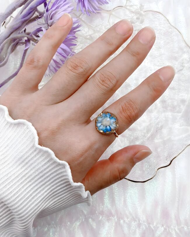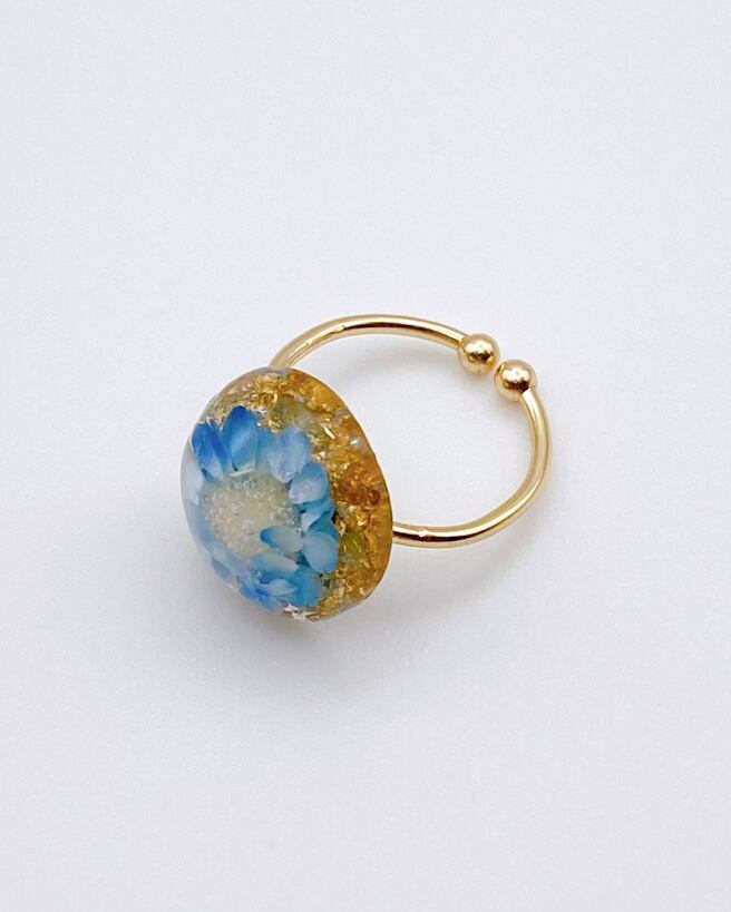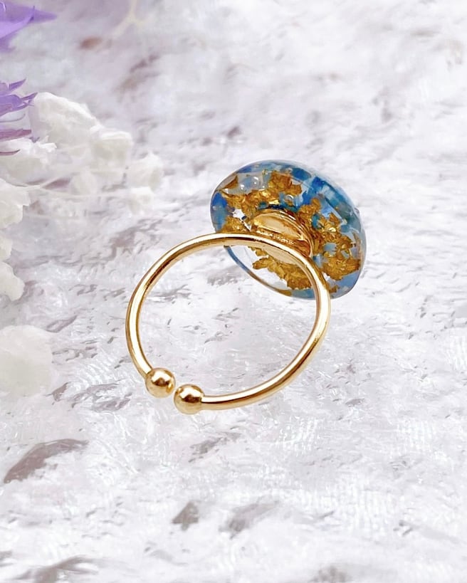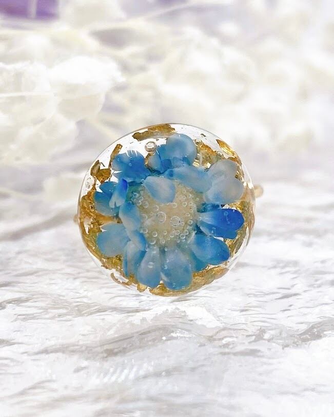 【園の送迎に】指先に小さな水辺。ブルーのお花と金箔のボタニカルレジンリング。フリーサイズ
