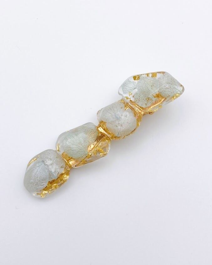 【雨の日も、暑い日も】簡単きれい。透明感あふれる紫陽花と金箔のヘアクリップ。結んだ髪にサッと留めるだけで、横顔まで涼しげに。