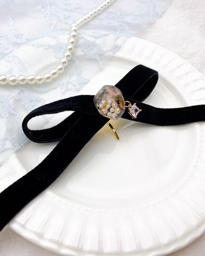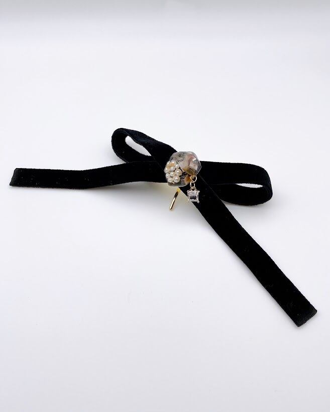 【送迎・習い事に】後ろ姿に小さなアンティーク。ベルベットリボンとレジンチャームのポニーフック。忙しい毎日にクラシカルな彩りを。