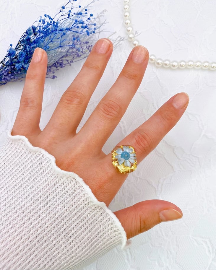 【園の送迎に】光をまとう花と金箔のリング。自分へのご褒美に。フリーサイズ(スカイブルー)