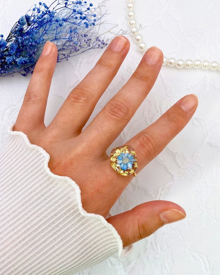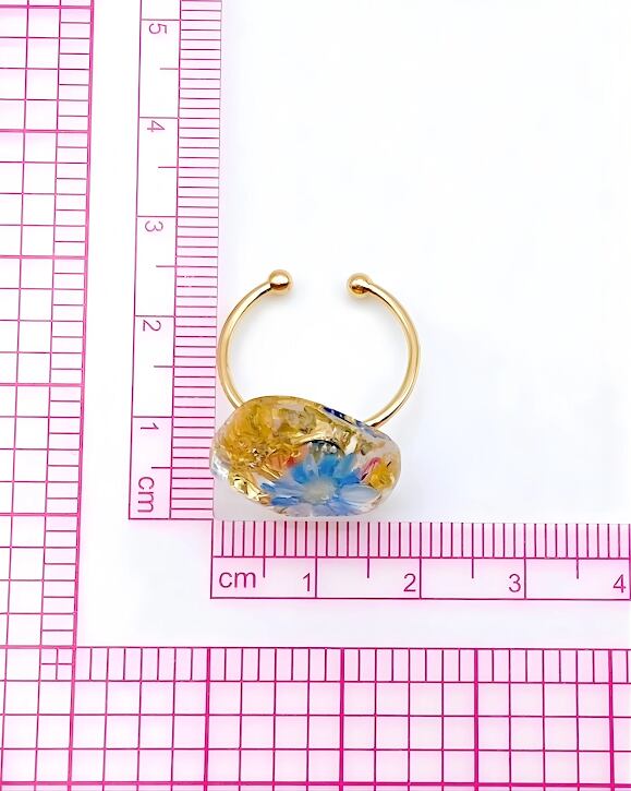 【園の送迎に】光をまとう花と金箔のリング。自分へのご褒美に。フリーサイズ(ブルー)