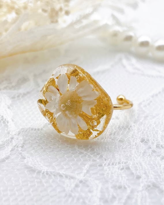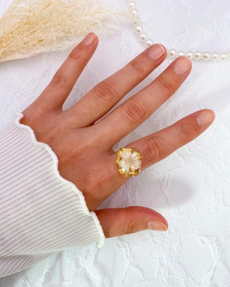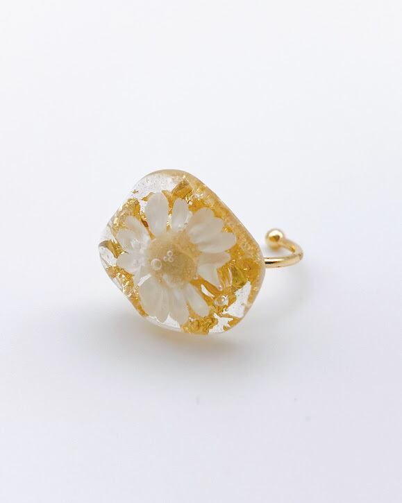 【園の送迎に】光をまとう花と金箔のリング。自分へのご褒美に。フリーサイズ(ホワイト)