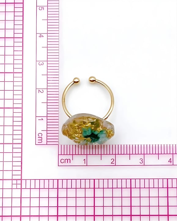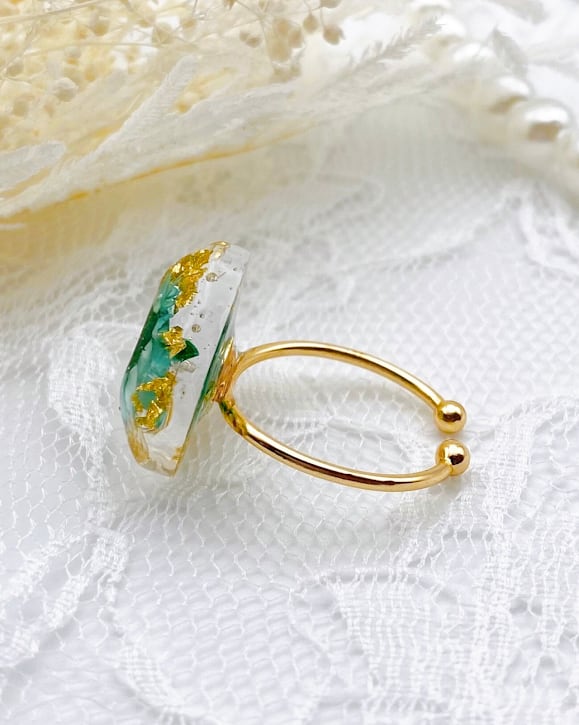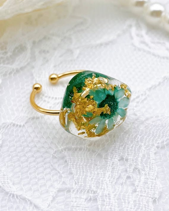 【園の送迎に】光をまとう花と金箔のリング。自分へのご褒美に。フリーサイズ(グリーン)