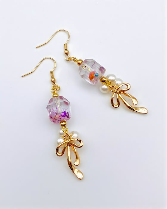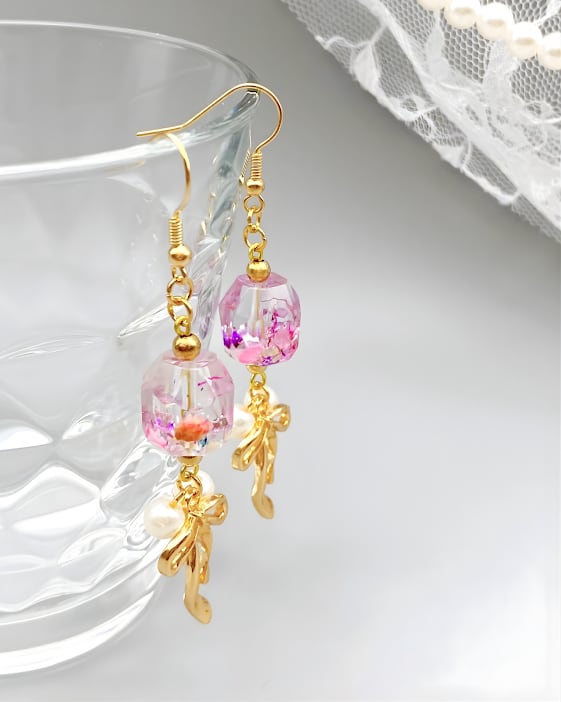 【懇談会・ランチ会に】大人可愛いレジンフラワーとパールの揺れるリボン ピアス/イヤリング
