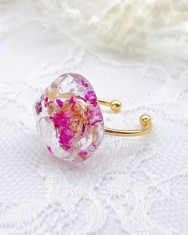 【自分へのご褒美に】指先に咲く小さな花園。ふんわりドライフラワーのレジンリング(マゼンタピンク)
